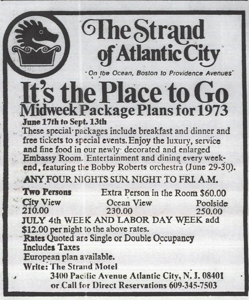 I first wrote about childhood summers in Atlantic City here. In Chapter 8 (Fathers and Sons Are Only Black and White in the Movies), I describe those magical summers in greater detail, lovingly recreating a motel called the Strand, which once stood between Boston and Providence Avenues just off the Boardwalk. On Newspapers.com, I found these contemporary advertisements, one from the June 25, 1972 edition of The Philadelphia Inquirer…
