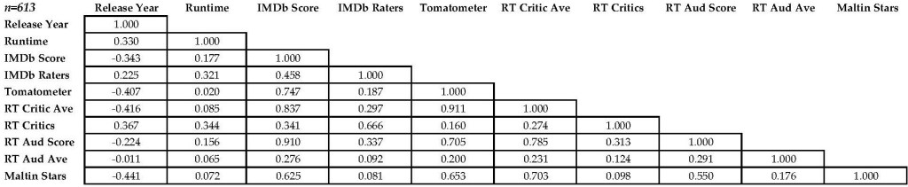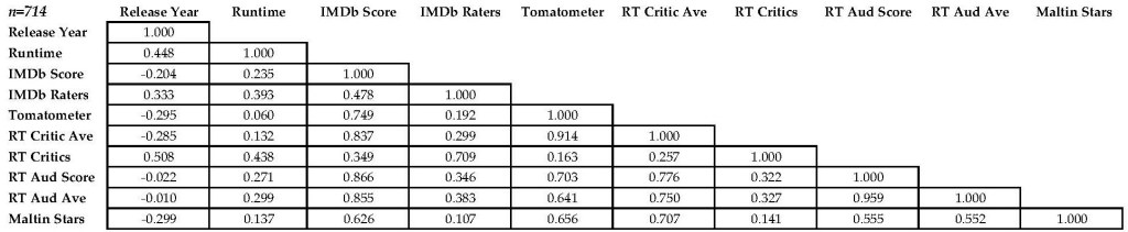 | Variable | RT Aud Score | RT Aud Ave | Maltin Stars | RT Critic Ave | Tomatometer |