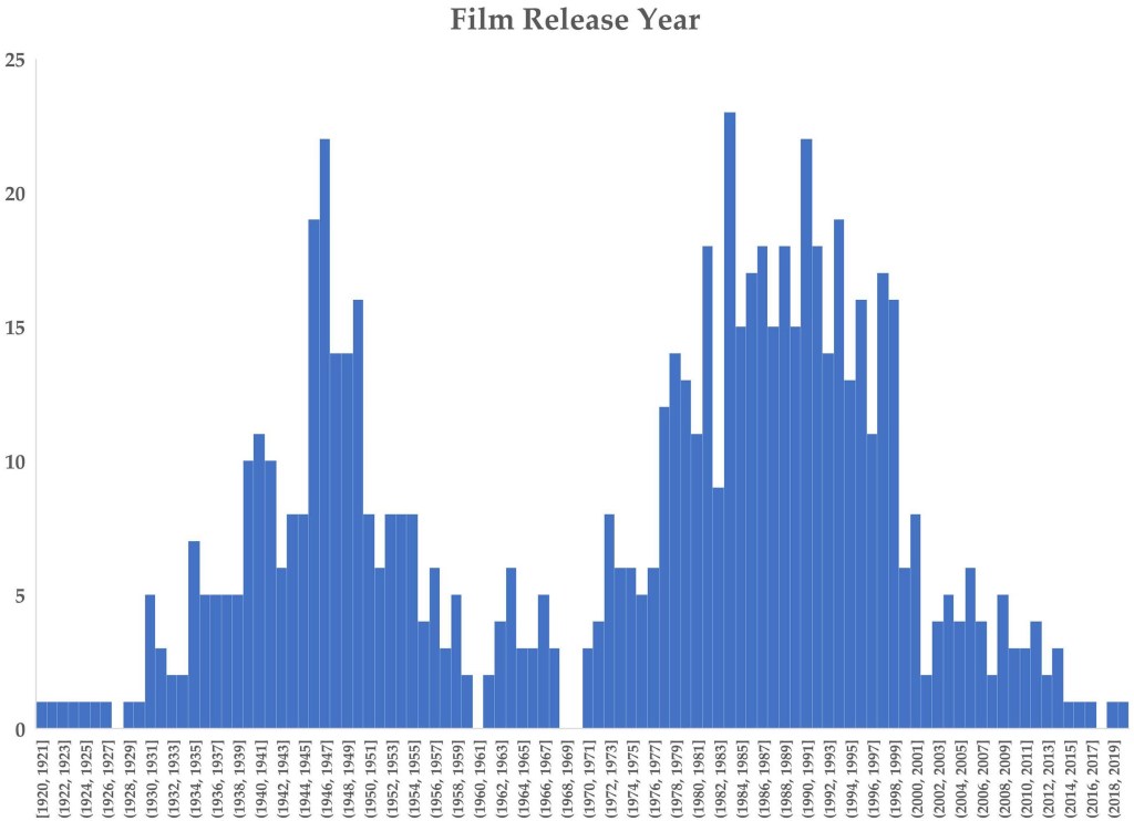 - Had identical mean and median release years – though maximum now 2020 (Tenet) and SD increased 2.0.