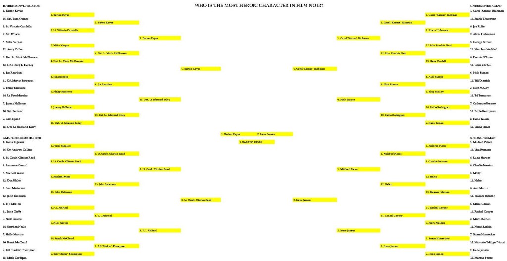The attached poll gave voters 24 hours to choose either Keyes or McPherson, with a reply tweet linking to an explanation of the tournament now underway. A few hours earlier, I had published this essay, setting out the characters, rules and matchups for the search for the Most Heroic Character in Film Noir. In two rounds of transparent – and often surprisingly difficult – decision-making, I had whittled the initial field of 64 film noir heroes down to 16, divided evenly across four loose categories: Intrepid Investigator, Amateur Crime Fighter, Undercover Agent, Strong Woman.