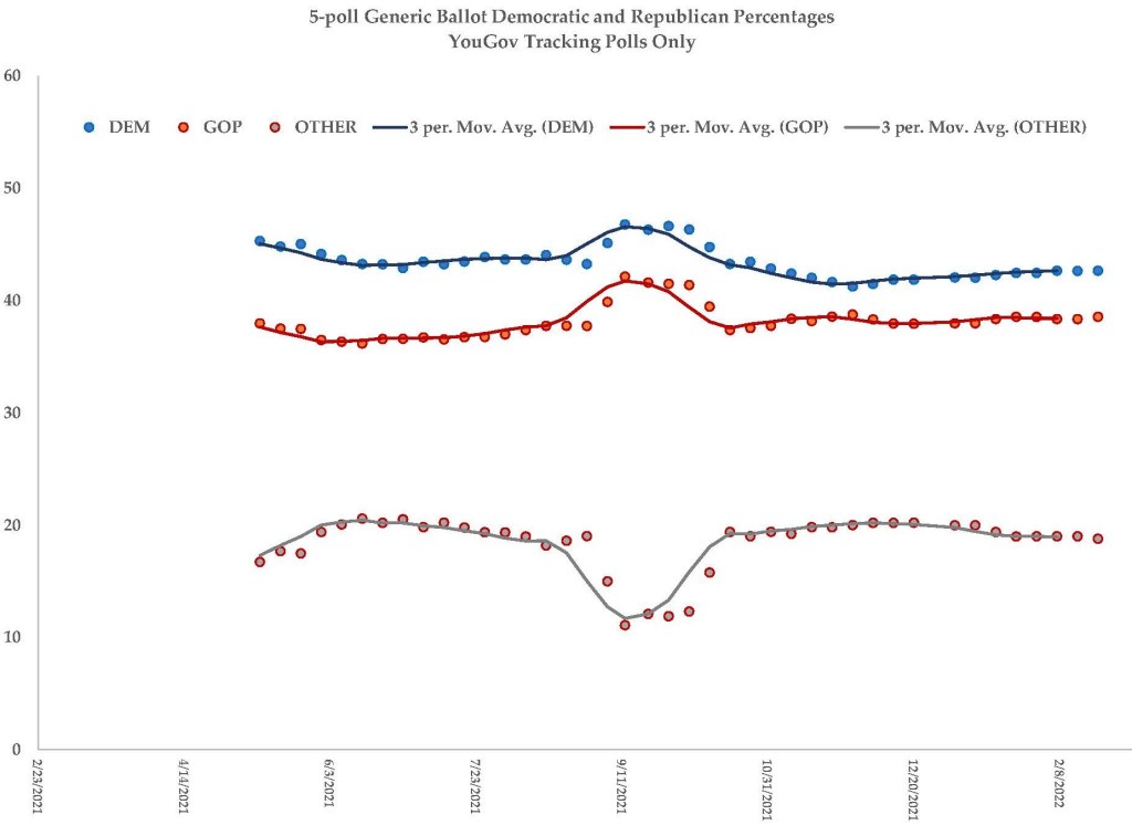 Compared to all other pollsters since May 2021, YouGov has consistently reported nearly 20% Undec/3rd – with one dramatic exception: mid-August to mid-October 2021, when it dropped from a prior average of 19.2% to a 10-week average of 13.0%; it has averaged 19.5% since then. Over that same period, the percentage choosing the Democratic candidate increased 2.2 points to 46.0%, while the percentage choosing the Republican candidate increased 4.0 points to 41.0%.[5] This is nearly a 2-1 break for the Republican candidate, although Democrats still led by an average 5.0 points.