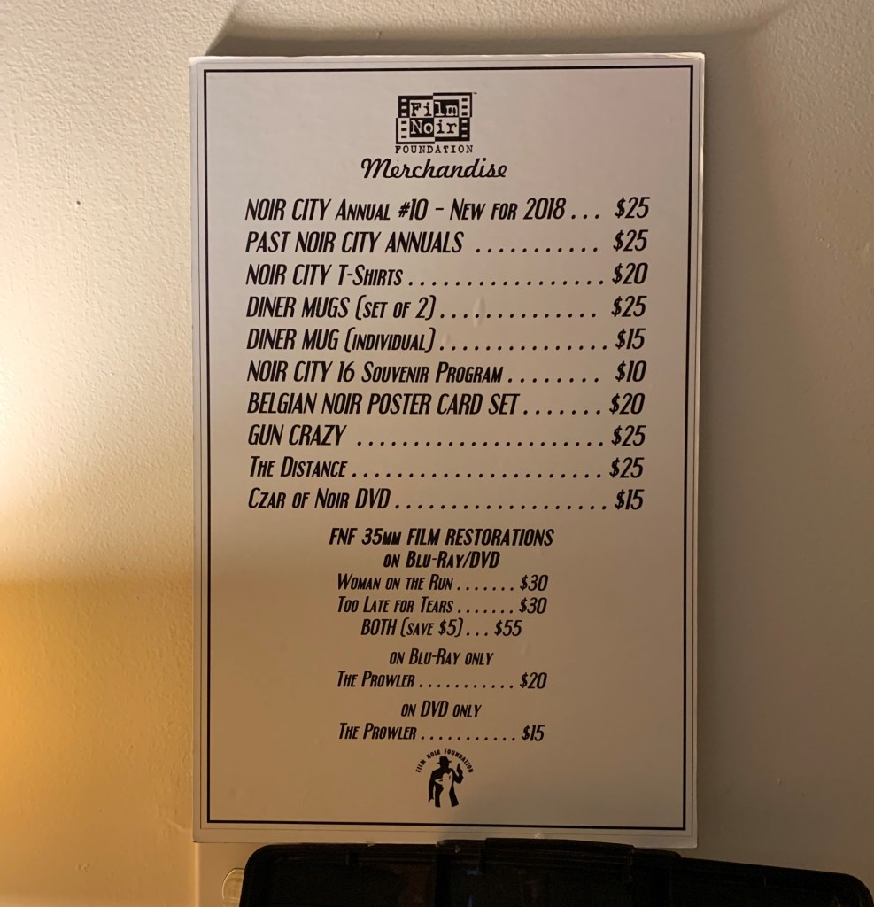 For all that, however, one aspect of the FNF to which I have paid insufficient attention in the past is the high quality of their swag. During the first incarnation of NOIR CITY Boston in June 2018, I ran the concession table with remarkable success (the presence of our two young daughters helped immensely); I kept the cardboard placard listing items for sale and their prices as a souvenir.