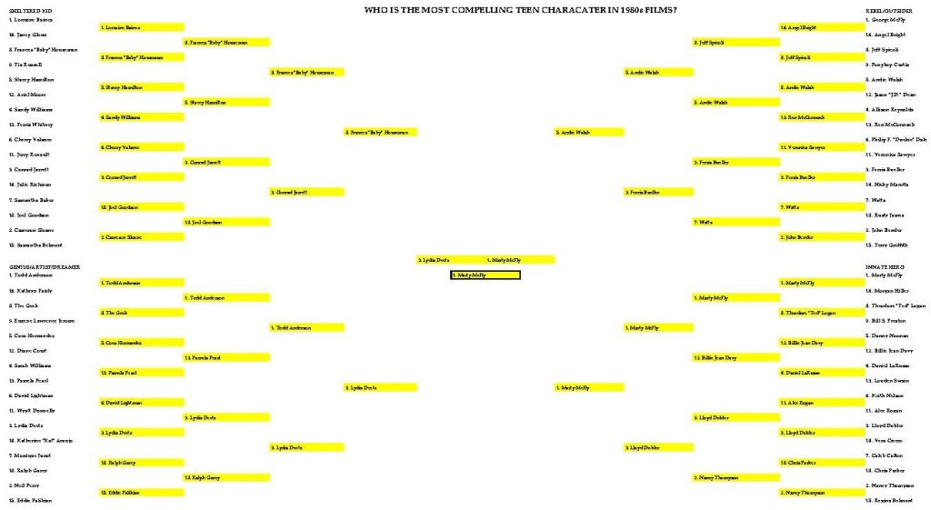 The attached poll gave voters 24 hours to choose, with a reply tweet linking to an explanation of the tournament now underway. A few hours earlier, I had published this essay, setting out the characters, rules and matchuWho Is the Most Compelling Teenaged Film Character of the 1980s?ps for the search for the Most Compelling 1980s Film Teen Character. In two rounds of transparent, difficult decision-making, I had whittled the initial field of 64 teen characters to 16, divided evenly across four loose categories: Sheltered Kid, Genius/Artist/Dreamer, Rebel/Outsider, Innate Hero – as well as between boys and girls.