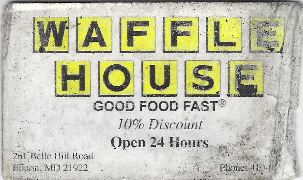 We decided to take things a bit more slowly this time – and, having learned my lesson the previous October, I simply listened and understood. This is why I did not spend the night with her on my first visit to Baltimore.[4] Nonetheless, that drive – after purchasing gas at a Drexel Hill Sunoco at 4:56 pm – was far happier than the one I had made five months earlier. Once I found her apartment building and parked, I recall walking down a darkened corridor to meet her – and something about a door being propped open. It was a joyous reunion. Her street-level apartment had a small enclosed patio, albeit abutting a parking lot. After having dinner and exploring her funky urban neighborhood – during which I spied a nearby 24-hour diner I planned to make my late-night hangout – we made out rather intensely on her sofa. I then drove back to Philadelphia. It is possible I stopped at the Waffle House in Elkton, MD – roughly the drive’s halfway point, just west of the Delaware state line – for coffee. I must have put a business card in a glass bowl by the cash register. Stored in my “2002” folder is an undated letter from this Waffle House, addressed to me at FPC, which notes “[e]nclosed are several coupons.” This is almost certainly when I acquired the discount card I still keep in my wallet.