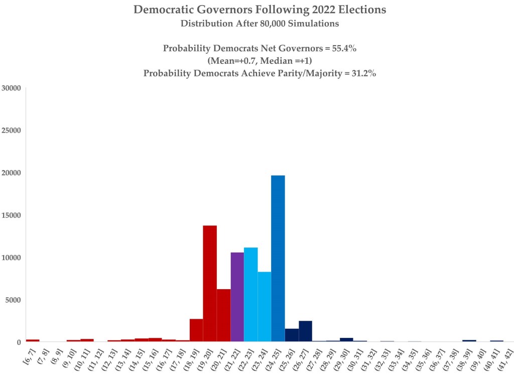 A net gain of three governor’s mansions by Democrats would give them 25, giving them parity for the first time since 2010. Table 3 shows updated values for all 36 gubernatorial elections in 2022.