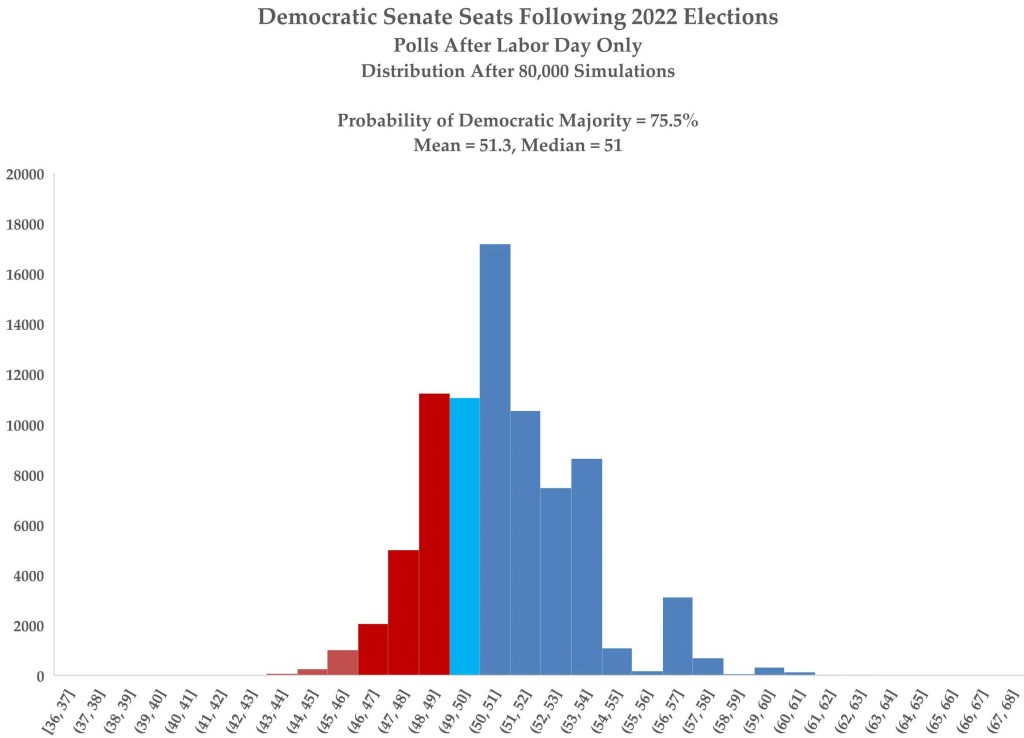 Bottom line: There is a 77.0% chance (75.5% using post-Labor-Day polls) Democrats hold at least 50 Senate seats – and thus maintain the majority. There is also a 63.4% chance Democrats net add Senate seats, with one being the most likely outcome (21.8%). There is also an 18.6% chance Democrats net lose one seat, giving Republicans a narrow 51-49 majority. Overall, there is a 52.7% chance Democrats land between a net loss of one and a net gain of two Senate seats, for an over/under of +0.5. While these values are lower than last week, much of that is due to methodological tweaks and Republican-leaning polling.