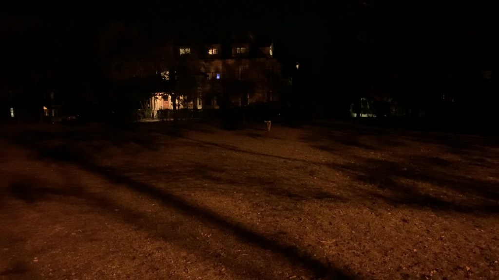 A few days ago, I took our golden retriever Casper to a local park for a long run. It was late at night – or, rather, early in the morning – so we had the park virtually to ourselves. I used a Chuckit! to fling an oversized tennis ball against a high chain link fence a few dozen yards from where I stood; this photograph from a different visit gives you a sense of the distance. Casper dutifully raced after the ball and brought it back to me.