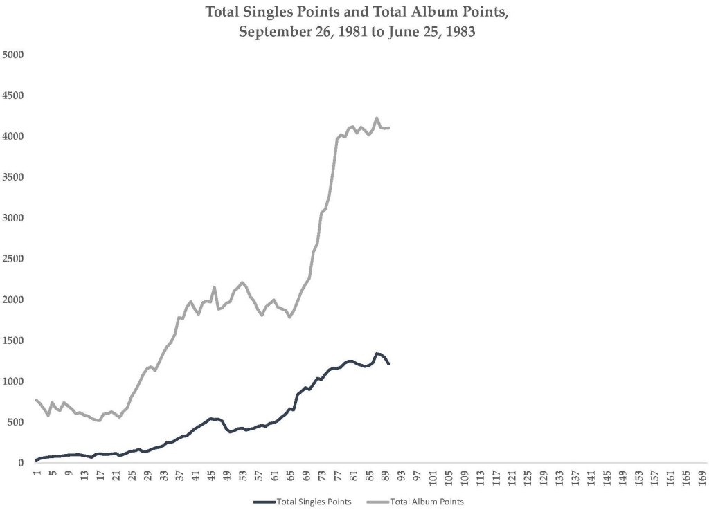 In a previous essay, I used weekly chart positions in the Billboard Hot 100 (singles) and Top 200 (albums) charts to trace the Second British Invasion (“SBI”) from the week of September 26, 1981 through the end of June 1983, just as it reached its first peak. Figure 1 tracks total singles and album points during this time. I used weekly chart positions to calculate points for 171 singles and 186 albums released by a total of 94 unique artists.