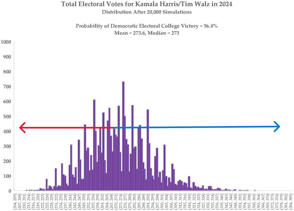 I do not yet account for “systematic” error for two reasons. First, I do not know exactly how much to increase the “sample-size” margin of error to account for it; increasing MOE pushes every state’s win probability closer to 50%, flattening the distribution of Electoral Vote totals shown above and bringing it closer to a pure Normal Distribution. One rule of thumb is to double the MOE – but does that mean doubling my 10-poll MOE, or multiplying it by the square root of 2 (~1.4)? Let us try doubling every state MOE. This lowers the median Electoral Vote total for Harris to 276 (mean = 276.5) and her win probability to 62.0%, still within the “Lean Democratic” range.