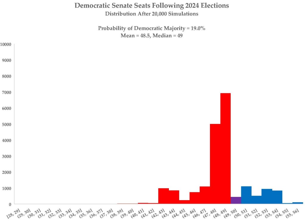 September 18, 2024: If polls of the Montana Senate race are valid, then the likeliest outcome of this year’s Senate elections is 51 Republicans and 49 Democrats. If Harris is also elected president, though, it would only take one Republican defection for a 50-50 tie, which Walz would break. Moreover, if two Republicans simply became Independents, Democrats would control the 49-49-2 chamber.